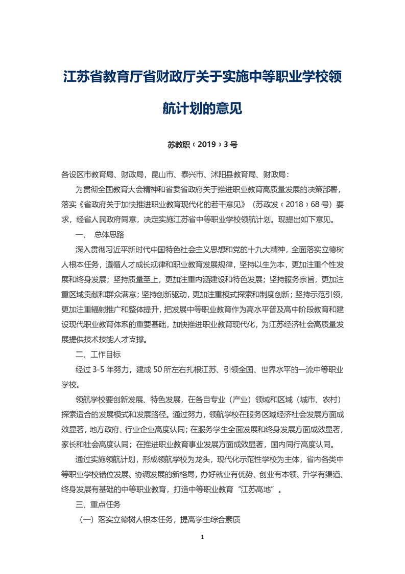 江苏省教育厅省财政厅关于实施中等职业学校领航计划的意见