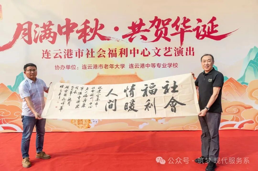 现代服务系代表学校向福利中心赠送了由学校山海书画院创作的书法作品《社会福利,情暖人间》。这份寓意深远的礼物,不仅为演出活动增添了文化底蕴,更传递了学校对福利事业的深切关怀与美好祝愿。
