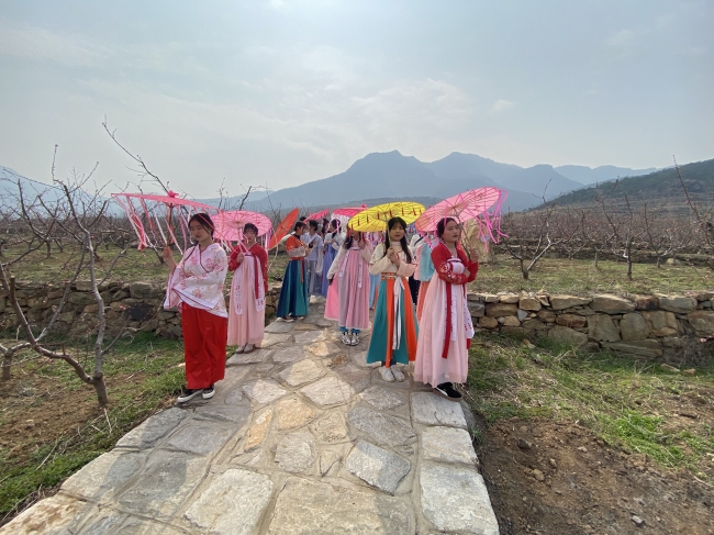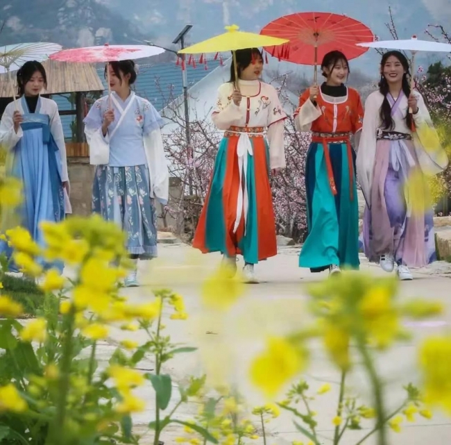 现代与传统相和鸣,自然与人文相呼应,汉服、诗词与桃花相融,引得游客们驻足观看,点赞、喝彩——身穿汉服在桃花园间穿行,古朴的汉服与粉嫩的桃花相呼应,别有一番风味。