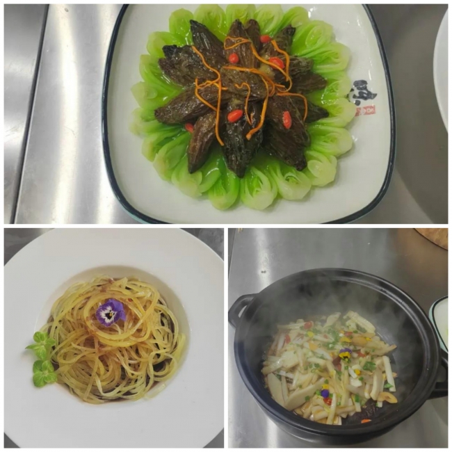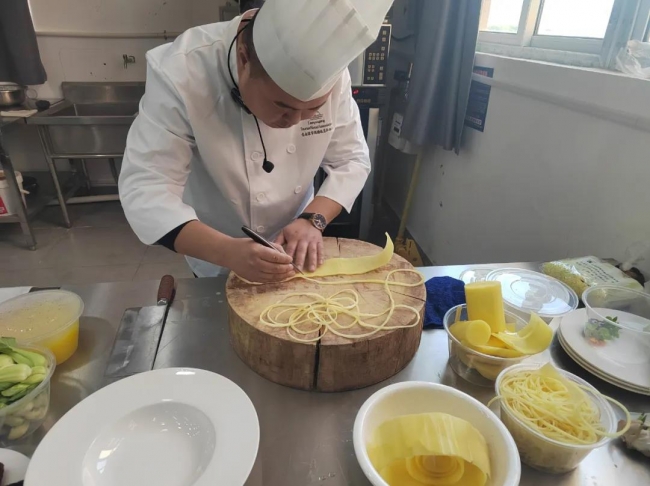 此次,蒋大师为同学们带来的三道菜品分别是龙须土豆丝、虫草金汤羊肚菌、爽口根根菜。采用的食材一个是普通、价廉但补充能量必不可少的土豆,一个是名贵且养生不可或缺的羊肚菌,一个是冬季餐桌常见的娃娃菜和大乌贼。三道菜肴兼具口味、美感、养生于一体。