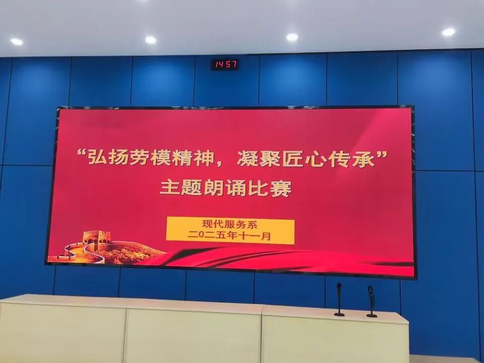 为深入弘扬劳模精神、劳动精神、工匠精神,激发同学们的爱国情怀与奋斗热情,2025年11月17日下午,现代服务系“弘扬劳模精神,凝聚匠心传承”主题朗诵比赛在阶梯教室举行。本次比赛以声音为媒介,以精神为内核,为全体师生呈现了一场兼具思想性与感染力的文化盛宴。
