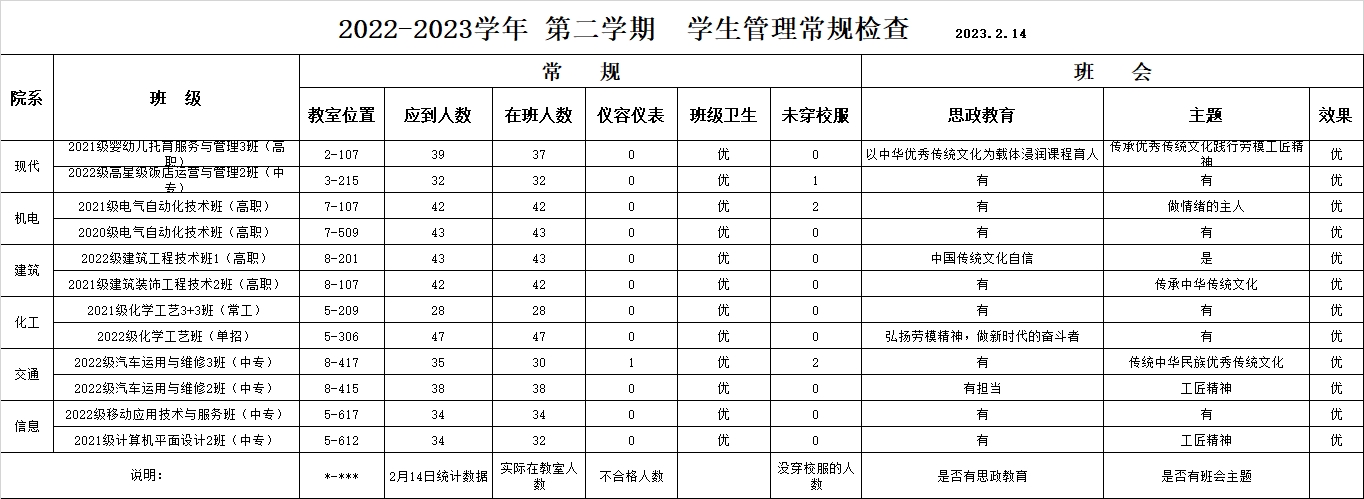 本次检查以班级为单位,对学生的仪容仪表、班级卫生、校服穿着,班会课的思政教育、班会主题、班会效果等方面进行检查,发现校服穿着不整齐、教室卫生工具摆放不整齐、多余的书乱堆放、在校人数有出入等问题。班会中,还需要增加思政教育、民族团结教育等主题,增加时政时事教育,如喜迎全国两会召开等元素。