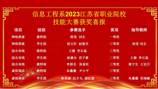 2023年2月20日,江苏省职业院校技能大赛传来喜讯,信息工程系喜获学校2023年江苏省职业院校技能大赛首金。我校信息工程系程莹、刘全教师团队喜获网络搭建与应用赛项一等奖第一名,冒文轩、赵楚齐荣获学生组三等奖(指导教师程莹、刘全);省赛网络综合布线项目,学生赵健全、苗子豪荣获学生组二等奖(指导教师:李石磊、王健),李国全、张家旺荣获学生组三等奖(指导教师:梁宁生、王宏升),李石磊、王健教师团队荣获教师组三等奖;省赛虚拟现实项目,朱薇、尹小平教师团队获教师组三等奖,学生陈思涵、纪宇凡、胡亿莲获学生组三等奖(指导教师:朱薇薇、范瑞敏)。信息工程系取得了1金1银5铜的好成绩。