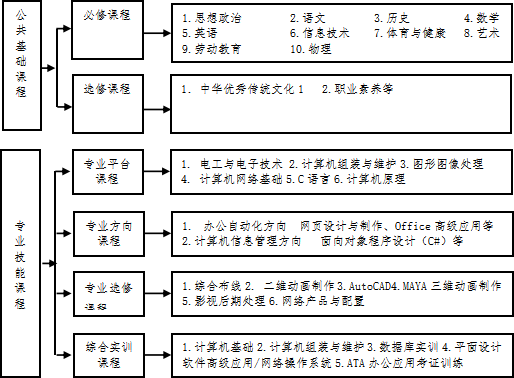 9.任意选修课程结合学生个性发展需求和学校办学特色,结合我校技能大赛进课堂课程改革项目,针对性开设以下课程:综合布线、CAD、计算机高级等课程。