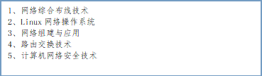 1.IP地址与子网划分; 2.静态路由配置及RIP动态路由配置; 3.局域网实现技术、互联网原理与技术; 4.小型局域网的连接和常见连接故障的排除方法; 5.结构化布线系统的组成与技术; 6.网络操作系统的功能与基本操作。 |