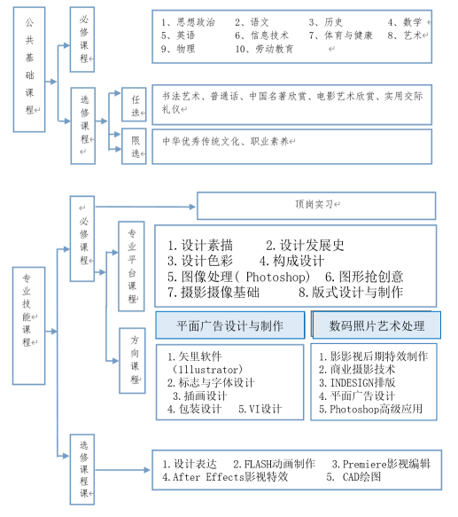 专业主干课程总学时为1314,其中专业平台课程426学时,方向课程314学时,专业选修课程分为: 设计表达、Flash动画制作、Premiere影视编辑、After Effects影视特效、CAD绘图。